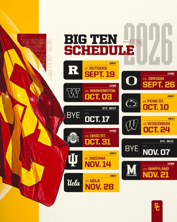 🔼 Mark the Calendar! The 2026 Big Ten football schedule is here! The Trojans open the season at Rutgers on Sept. 19. The first home game is against Oregon on Sept. 26. The season will finish with a crosstown rivalry game against UCLA on Nov. 28.