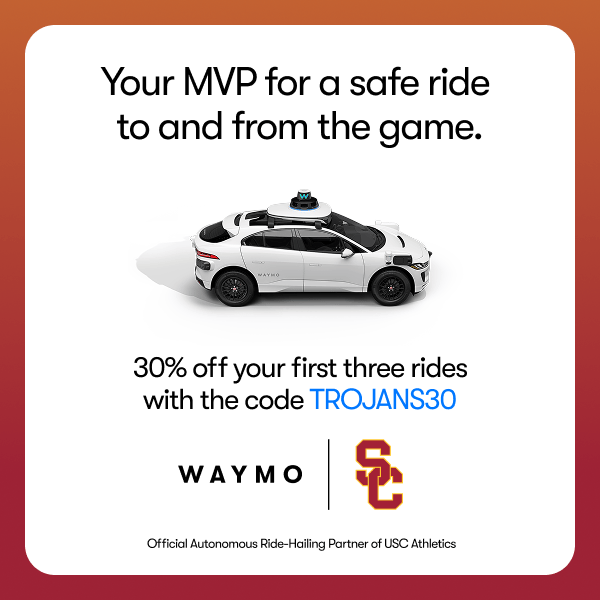 Get to and from the game safely and effortlessly with Waymo! No need to worry about parking or navigating traffic—just hop in and enjoy the ride. Use code TROJANS30 for 30% off your first three rides. Fight On! ✌️