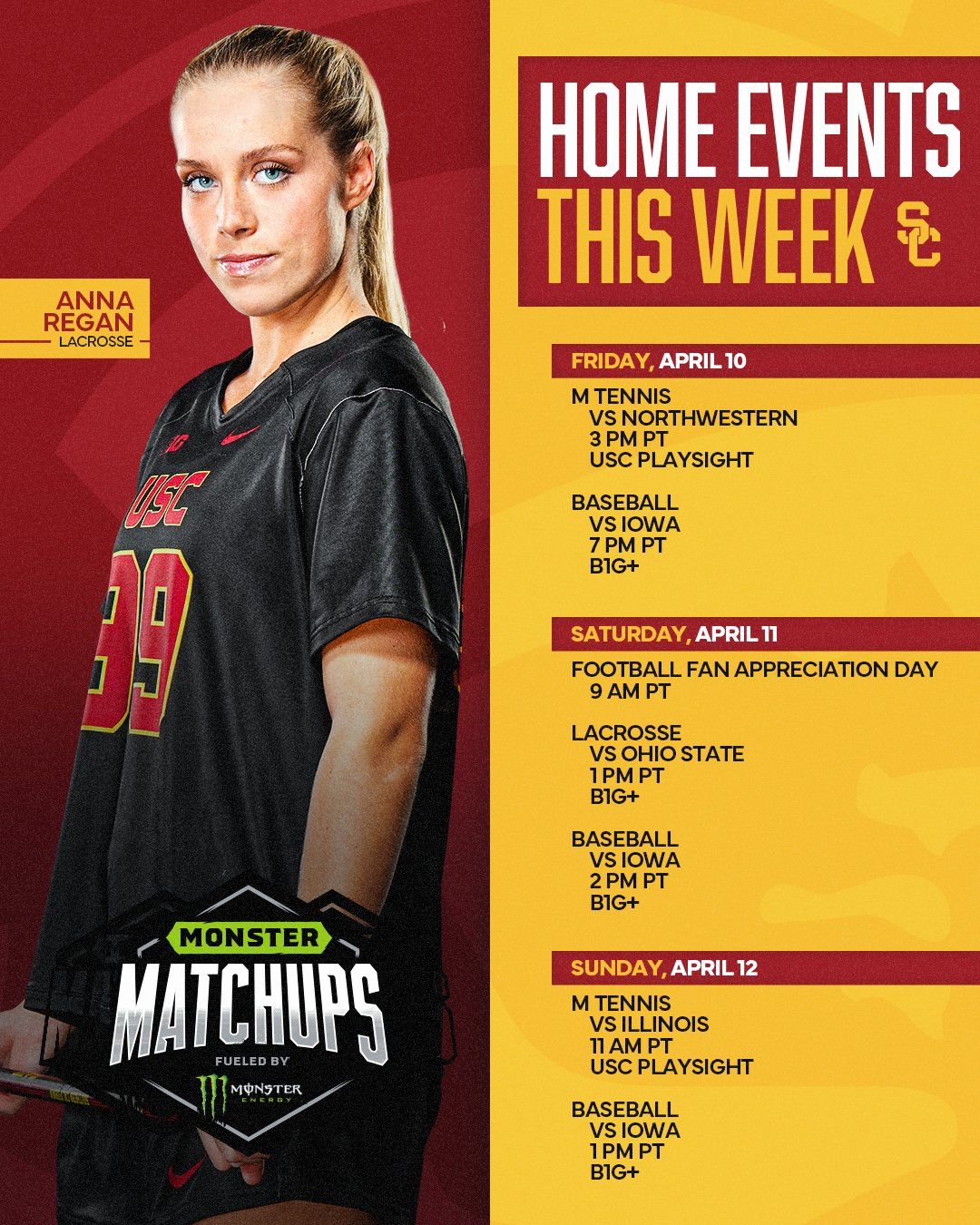 🔼 Rule the Track. The track and field team had two athletes earn Big Ten weekly honors. Madison Whyte was named the Women’s Track Athlete of the Week. Her times in the 200m and 400m rank No. 3 in the 200m (22.73) and No. 2 in the 400m (50.06) this season in the NCAA. Oluwatosin Awoleye was named the Freshman of the Week. Her debut time of 2:02.21 in the 800m broke the USC freshman record set 28 years ago.